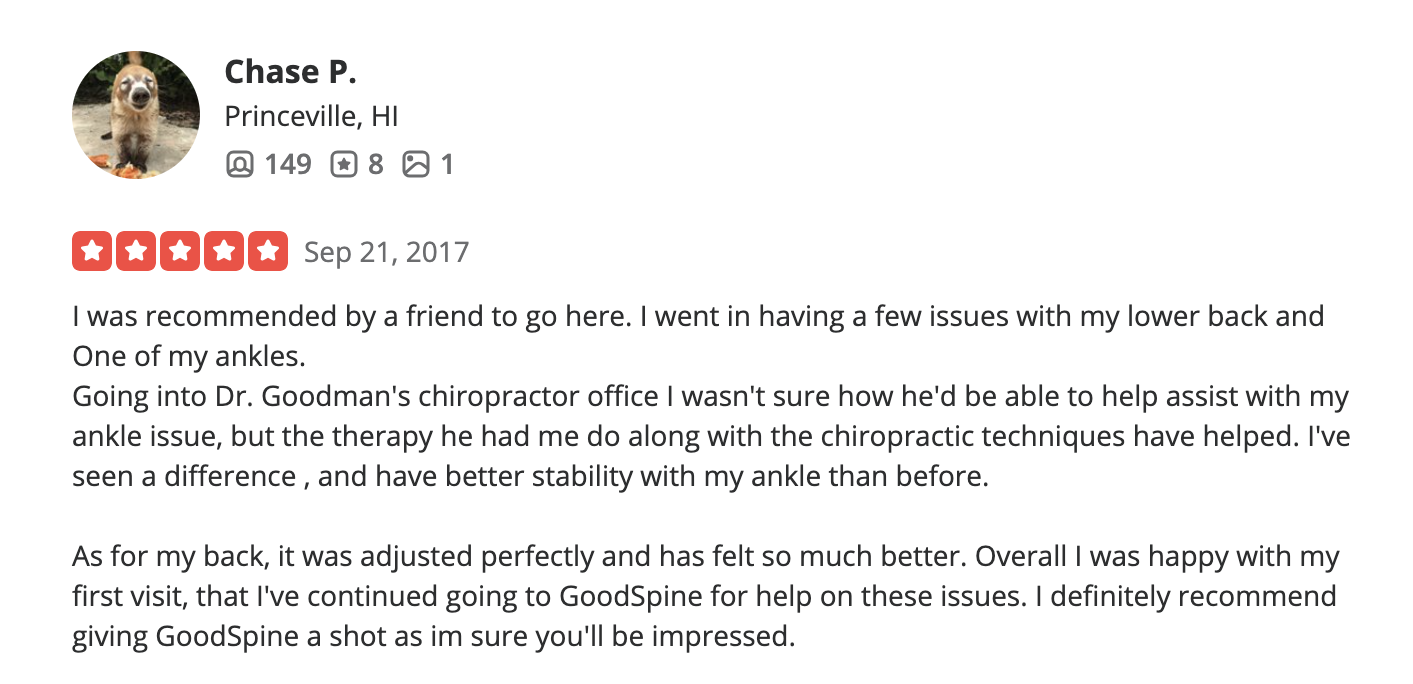 At GoodSpine, we believe your body deserves more than just quick fixes. Rooted in cutting-edge research and the latest sports medicine techniques, we deliver precision-driven care tailored to your unique needs. Whether you’re an athlete, weekend warrior, or simply seeking pain-free movement, our full-body approach identifies the root cause of dysfunction and creates a personalized, actionable plan. Trust us to get you back to doing what you love—stronger, faster, and ready to perform at your best.